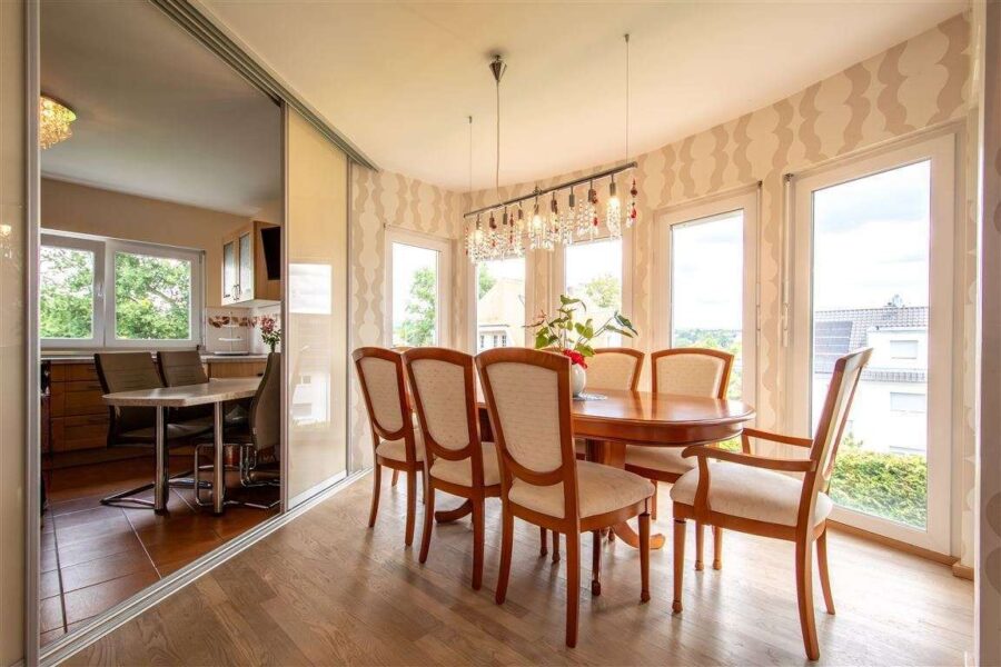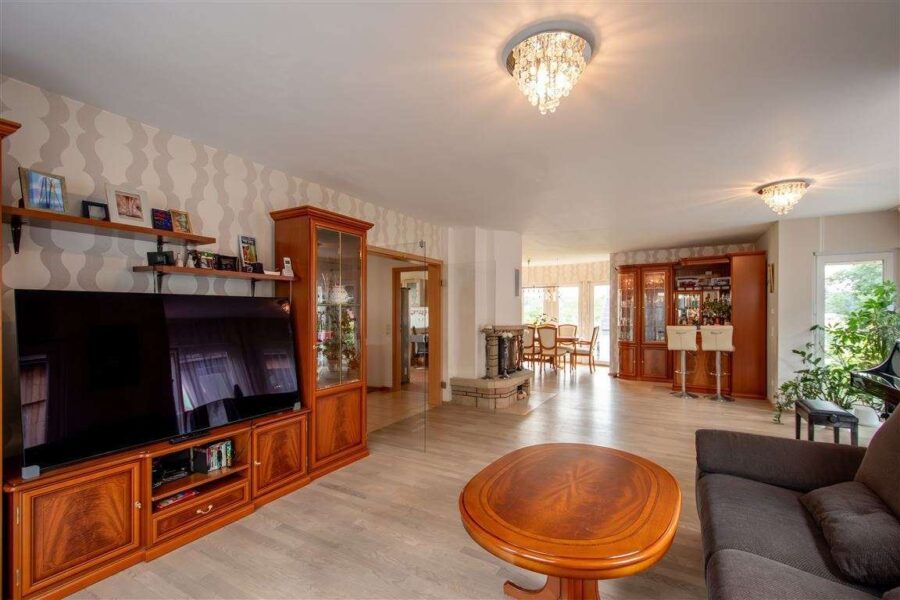 - Großer Wohn- und Essbereich (ca. 49 m²) mit  hochwertigem Parkett und Holz-Panorama-Kamin (Schornstein) im EG und Zugang zur Süd-West-Gartenterrasse mit ca. 31 m² (ca. 8 m² Wfl.)