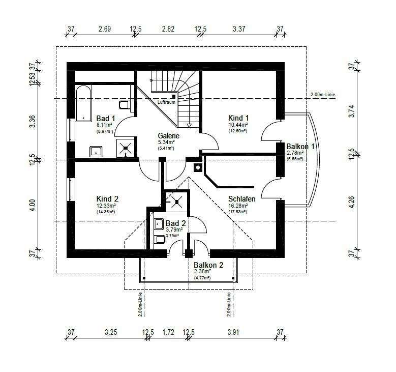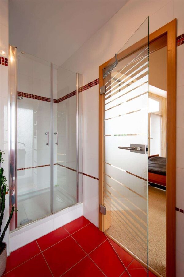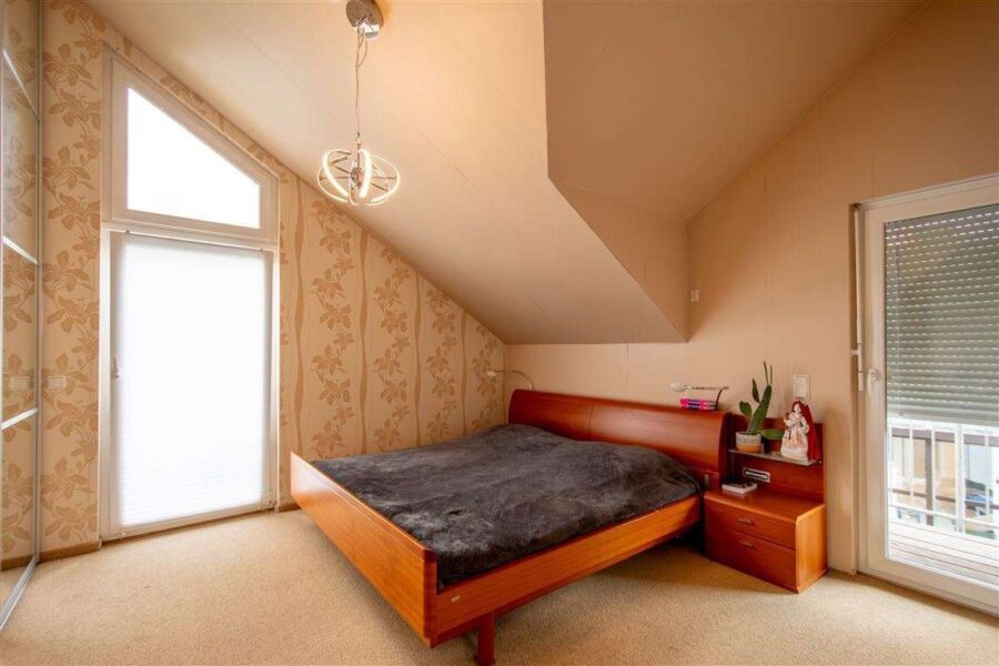 - 3 schöne Schlafzimmer im OG (ca. 17 m², 12 m² und 10 m²). Masterbedroom mit Einbaukleiderschrank, En-Suite Duschbad (ca. 4 m²) und Zugang zu zwei Balkonen ca. 5 und 6 m² (50% Wfl. = ca. 2,5 und ca. 3 m²), Kinderbad im OG mit Wanne, Dusche und Handtuch-HK (ca. 9 m²), Gäste-WC im EG (ca. 2 m²)