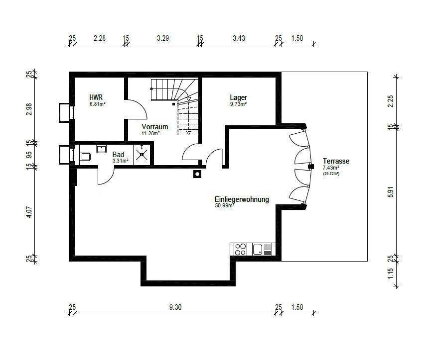 Das Untergeschoss dieses Einfamilienhauses ist im Hinblick auf die Hanglage weit mehr als nur ein Keller – es präsentiert sich bei Bedarf und einer Renovierung bzw. Modernisierung als vollwertige und äußerst flexible Einliegerwohnung mit separatem Eingang. Das Herzstück bildet ein ca. 51 m² m² großes Studio mit integrierter Küchenzeile und separatem Duschbad (ca. 4 m²). Hier wurde eine vormals vorhandene Wellnessfläche (Schwimmbad) umgestaltet, um weiteren Wohnkomfort für die Eltern der Eigentümer zu bieten. Das Highlight des Untergeschosses ist der direkte Zugang über die bodentiefen Fenstertüren zur zweiten, Nord-Ost-Gartenterrasse mit ca. 30 m², die ebenfalls zu fairen 25% in die Wfl. (= ca. 8 m²) eingerechnet ist. Als Keller- und Lagerflächen steht ein Kellerraum mit ca. 10 m² und die UG-Diele (Erschließung über eine Innentreppe zum EG) mit ca. 11 m² zur Verfügung. Der Hausanschluss- und Waschraum ist ca. 7 m² groß.