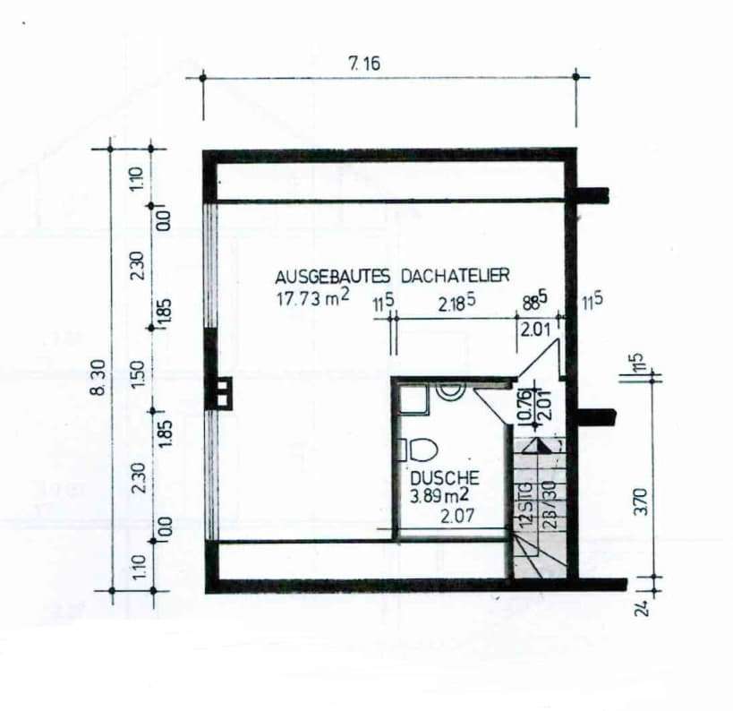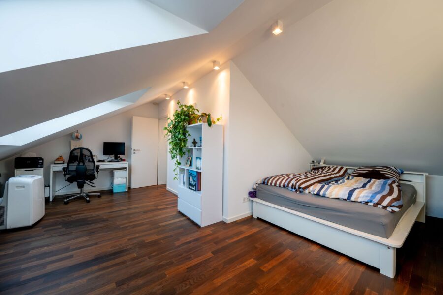 Das vollständig ausgebaute Dachgeschoss eröffnet zusätzliche Möglichkeiten: Das helle Studio (ca. 18 m²) mit großen Dachfenstern und praktischen Abstellflächen in den Schrägen eignet sich ideal als Eltern-, Jugend-, Gäste- oder Arbeitsbereich. Ergänzt wird diese Ebene durch ein zweites Bad mit Dusche (ca. 4 m²) – ein echter Mehrwert im Alltag.