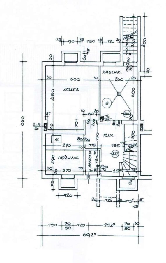 Im Keller stehen ein Hobbyraum (ca. 16 m²), ein Hauswirtschafts- und Waschraum (ca. 10 m²), ein Technikraum (ca. 8 m²), ein Abstellraum (ca. 2 m²) sowie ein weiterer Flur mit ca. 8 m² zur Verfügung.