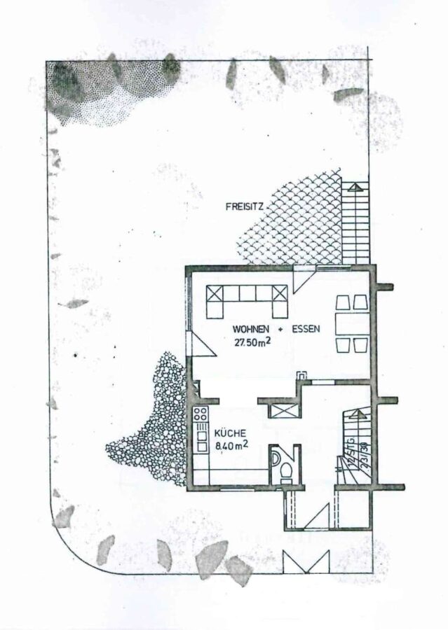 - Grundriss mit halboffener, lichtdurchfluteter Küche und Wohn- und Esszimmer mit Anschluss an die Süd- (ca. 15 m²) und Süd-Westterrasse (ca. 10 m²) und den großzügigen Garten