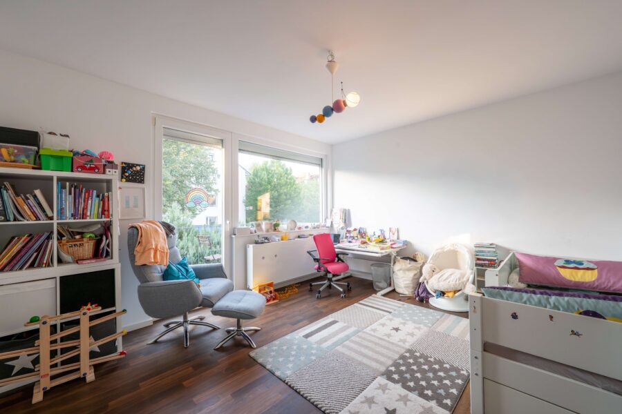 Im Obergeschoss erwartet Sie ein ruhiges Schlafzimmer (ca. 15 m²) mit Süd-West-Balkon (ca. 4 m², anteilig ca. 1 m² Wohnfläche) als persönlicher Rückzugsort. Das ca. 12 m² große Kinder- oder Arbeitszimmer eignet sich flexibel für Familie, Gäste oder Homeoffice. Das moderne Familienbad (ca. 9 m²) mit Badewanne und Dusche überzeugt durch seine hochwertige Ausstattung, unter anderem mit Keramag-Badmöbeln. Eine großzügige Diele (ca. 10 m²) verbindet die Räume harmonisch miteinander.