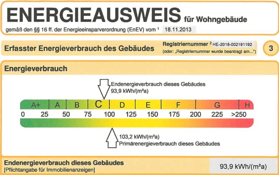 - 2013: Heizung erneuert, Zentralheizung mit Erdgas H, Verbrauchsausweis aus 2018 mit Energiekennwert: 93,9 kWh/m²a, Klasse C