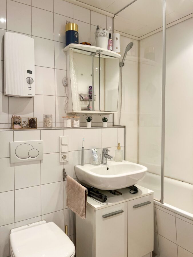 - Helles Badezimmer mit Badewanne (integrierte Dusche mit Glasabtrennung)