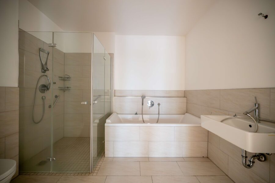 - Großes Badezimmer mit Wanne und bodengleicher XL-Dusche en suite (zum Schlafzimmer; ca. 8 m²)