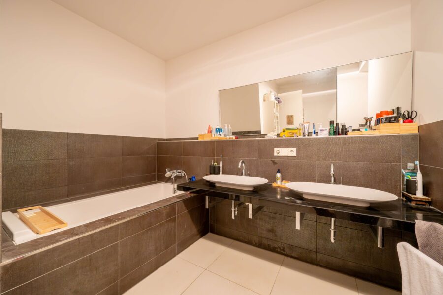 Das moderne Badezimmer ist mit einem kleinen Flur (ca. 2 m²) an ein Schlafzimmer und den Wohn-Essbereich angebunden und ist mit ca. 11 m² großzügig und hochwertig ausgestattet. Es verfügt sowohl über eine Badewanne als auch über eine Dusche.
