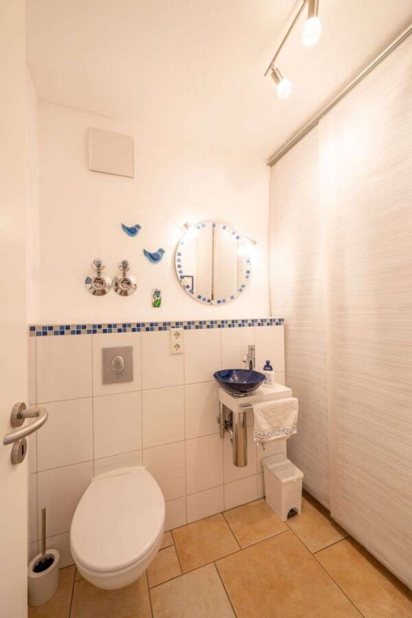 Von der Wohnungstür gelangen Sie in eine offene Diele (7,4 m²) mit einem Gäste-WC (3,7 m²) auf der linken Seite, das gleichzeitig einen praktischen Abstellbereich für Waschmaschine und Haushaltsgeräte beherbergt.