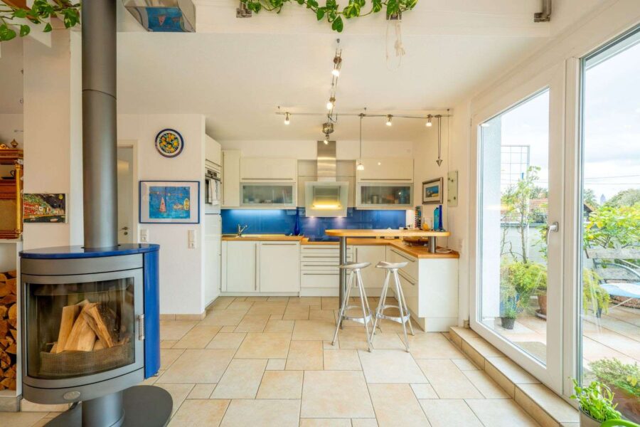 Direkt im Anschluss öffnet sich der großzügige, lichtdurchflutete Wohn (29 m²) - und Essbereich (14 m²) und offener Küche (10 m²) mit moderner Einbauküche und hochwertigen Markengeräten. Hier schaffen helle Farben, klare Linien und ausgewählte Materialien ein stilvolles Wohnambiente.